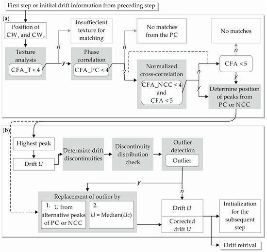 Flow diagram of the correlation procedure (a) and the outlier detection/handling; (b) CW1,2—Correlation window pair for performing the PC (phase correlation), NCC (normalized cross correlation), and the various CFA parameters, CFA—confidence factor, T—texture. See Section 2.1 and Section 2.2 for further explanation.