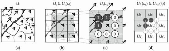 where b (=1.4826) is a constant linked to the assumption that data are normally distributed. The index l = 1…L refers to the L-connected drift vectors Ucl. The MAD is a robust statistic in the presence of outliers, and not sensitive to the sample size [11,12]. An outlier in the center of the 3 × 3 window is detected if M > 2∙MAD, and replaced as described in Figure 1b and Section 2.1. If M ≤ 2∙MAD, the central drift vector matches into its neighborhood and remains unchanged.