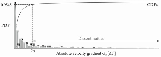 Probability density function (PDF) of the absolute velocity gradient Gijk and the exponential fit. Absolute gradients higher than two standard deviations (2σ) are considered as discontinuities.