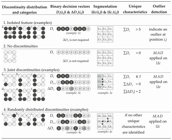 Examples of the spatial distribution of discontinuities at position i,j for all categories, the binary decision vector Dk and the calculation of the “ring difference” ΔDk. The white circles indicate small gradients (≤2σ), the black ones indicate large gradients considered as discontinuities (>2σ) (see Figure 2). The third column shows the segmentation of the 3 × 3 grid cell window required for the outlier detection and median calculation. The fourth column presents the unique characteristics for the identification of the respective category. In the fifth column, the method to detect an outlier in the corresponding category is listed. Category 1 (isolated feature) directly indicates an outlier at position i,j.