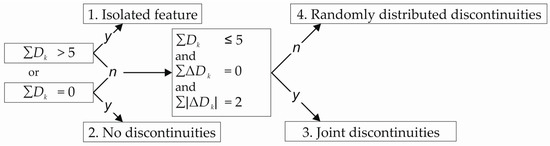 In the next step, the position i,j is categorized considering the spatial distribution of the identified discontinuities: isolated feature (1), no discontinuities (2), joint discontinuities (3), and randomly distributed discontinuities (4). The typical characteristics of these types are shown in Figure 4. Note that the eight grid cells around the center of the window represent gradients (categorized by their magnitude, according to Equation (3)). To determine the prevalent category, we defined unique characteristic of Dk and the “ring differences” ΔDk (Equations (3) and (4)) for each category (Figure 4, row 4).