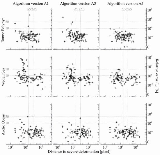 We found the most distinct improvement for the Weddell Sea scene, which exhibited the highest sea ice deformation rates ( in Table 4). This observation supports the assumption that an erroneous retrieval of a drift vector can be mainly attributed to the existence of discontinuities in the drift field. In Figure 7, we quantify the dependence between the relative error Erel and the distance to a severe deformation. The total deformation per acquisition time gap Δt (Equations (12)–(14)) is derived using the output of algorithm version A5, since it represents the most reliable sea ice drift field. We considered a total deformation greater than 0.2 per time interval Δt as severe, and used the corresponding locations as reference for calculating the minimum distance to the adjacent drift vectors, for which the relative errors obtained from versions A1 to A5 of the retrieval algorithm could be determined relative to a reference vector. Figure 7 shows results for A1, A3, and A5. If the distance to a severe deformation is larger than two times the grid spacing (2ΔS), a sufficiently low error is achieved. Inaccurate drift vectors (Erel > 10%) are primarily observed particularly close (distance < 2ΔS) to a severe deformation. Highly inaccurate vectors (Erel > 50%) only occur in A1 and A3.