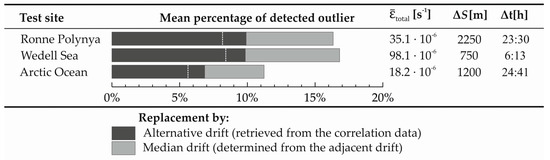 In general, the improvement attributed to the reliability assessment (A3) is—with the one exception discussed above—significant in all drift fields for the three test sites shown in Table 5. In combination with the adapted outlier detection (A5), the algorithm provides highly accurate drift retrievals. The mean relative error (B1rel) of all three scenes is lower than 10%, and the number indicating a complete failure of the algorithm (B5) decreases to 0.