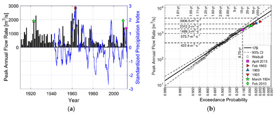 Figure 10b shows the exceedance probabilities and return periods of both systematic and historical (high outliers) floods. Floods highlighted with a green pentagram, and diamond symbols correspond with March 1924 and February 2010 extreme events, respectively, and an associated return period of about 20 years. Rare hydrological events with larger return periods occurred in 1960 (50 years) and 1963 (100 years).