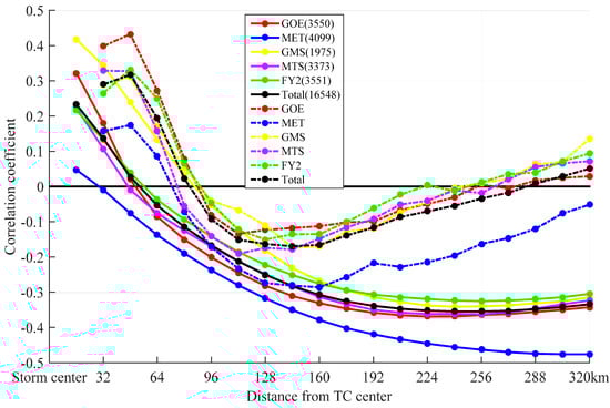 The solid lines in Figure 2 represent the variation in the correlation between the size of the TC and T1, T2,…, T20. There is nearly a positive correlation in the annuli within 64 km from the center of the TC. It suggests that in the inner core region (defined as an annulus of 40–50 km beyond the radius of the maximum winds) [41], a lower temperature in the TC cloud results in a stronger and larger TC, and vice versa. The largest correlation coefficient between the first annulus and the size of the TC was found forthe GMS series satellite data (correlation coefficient 0.42). The correlation was weakest at the boundary of the TC inner and outer region, about 48–80 km from the TC center, where the brightness temperature is not so related to TC size. The negative correlation becomes larger beyond 96 km from the TC center. The largest value (−0.48) occurs between 256 and 288 km from the center of the TC. Again, the result is obtained from the MET series satellite data. It appears that, in the outer region of the TC (1°–2.5° radii from the TC center) [42,43], the profile of the brightness temperature and its difference reflected an anomaly in the distribution of convection. The TC circulation field was larger at greater distances from the center of the TC and the TC was weaker and smaller in size. This result agrees approximately with previously reported studies [13,14,44,45,46,47,48].