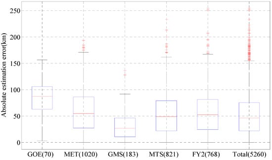 In order to evaluate the systematic differences of the TC size estimated from different satellites by the models, we analyzed the MET, GOES, and GMS data series (Table 2) that contain the time, spatial range, and continuity of different satellite series [38]. Comparisons are made between the same samples observed simultaneously by two different satellites.