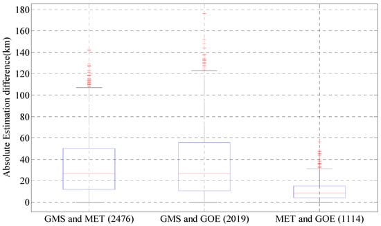 Comparison of estimation of TC size (each group represents the absolute difference between the estimates from two different satellites. The definition of the boxes is the same as in Figure 3).