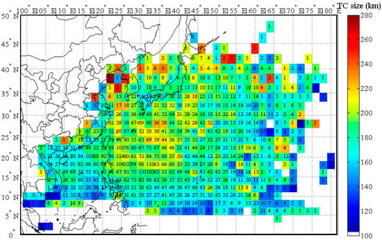Regional distribution of the size of TCs (The grid size is 2° × 2°. The numbers in each grid square is the sample size.)