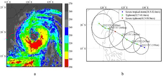 The Northwest Pacific (NWP) is a region where tropical cyclones (TCs) generate very frequently [1]. TCs are severe storms formed over tropical waters, and they are characterized by a non-frontal synoptic-scale low-pressure weather system, with organized convection and clearly-defined cyclonic surface wind circulation [1,2]. On average, about 33 TCs developed each year during the period 1949 and 2016 (analyzed using the best track from the China Meteorological Administration). TCs cause disasters leading to loss of life and property in the coastal areas where they pass. The center location, intensity, size, and extent of the destructive winds caused by TCs are key factors in decision-making for disaster reduction and prevention. In the early 1980s, Merrill [3] showed that hurricane winds (17 m/s) could occur in an area as small as 100 km or over areas greater than 2200 km in diameter. TCs of different size will have different impacts on the surrounding environment. Previous studies [4,5,6,7] have suggested that the size of a TC is associated with its movement, intensification, and rainfall. Timely estimation of the size, intensity, and track of a TC is important for weather forecasting and for predicting a TC’s potential impact [1,4,5,6,8,9,10,11,12,13]. Routine TC data are mainly focused on the center position and intensity of a TC. The hazard posed by a TC is often quantified in terms of TC intensity. While significant, these qualities must be balanced against considerations of the strength and spatial extent of the outer-core circulation, which also significantly determines the total danger posed by these storms [14]. A TC center and intensity are defined as the minimum pressure near the surface of the central point and the maximum sustained wind speed. Generally, TC size is measured by the extent of the destructive winds. Several studies have focused on the use of satellite images for locating the center of TCs [15,16,17,18], morphology [19,20,21], winds [22,23], and waves [24]. However, increasingly, research is being undertaken on the determination of TC size and climatology [3,4,5,12,25,26,27,28,29], and there has been much related research on the change of TC structure, relations between TC size and other systems, and the initialization of numerical model forecasting [5,6,11,12,13]. Past research has indicated that the initial vortex size in a numerical model is sensitive to TC intensity and wind radii, which is often defined as the radius of a zero tangential wind or the mean radius of the outermost closed isobar (ROCI) [5,10,14].