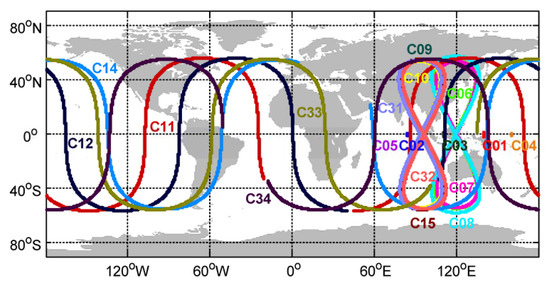 The 24-h ground tracks of BDS-2 and BDS-3 satellites available for positioning on 13 July 2016, are shown in Figure 1. The ground tracks of IGSO satellites describe two similar loops in the shape of figure-of-eight. The average difference between longitudes of the two loops is roughly 30°. For main-land China, IGSO satellites provide an optimum coverage. The satellites with inclined geosynchronous orbits show an improved availability in terms of high elevation angles. When users are in densely populated areas, the so-called “urban canyon” problem can be alleviated due to the presence of IGSO satellites. The ground tracks are confined from approximately 76.2°E to 138.0°E longitude and 57.5°S to 57.5°N latitude for the eight IGSO satellites. Five GEO satellites distributed in the Indian and Pacific oceans over the Equator further complement the IGSO constellation. As such, the users in Asian-Pacific regions can observe enough satellites. The five GEO satellites are fixed in longitude because of active control, whereas their ground tracks exhibit small variations of up to 2° in latitude. Similar to the GPS, GLONASS and Galileo satellites, the BDS MEO satellites offer complete global coverage. The ground tracks of the MEO satellites are confined from 56.1°S to 56.1°N latitude.