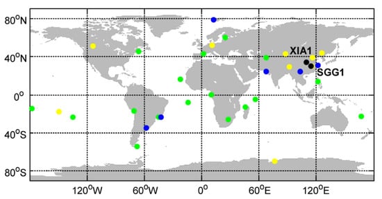 In order to achieve a good coverage of different latitude and longitude areas, we select 35 stations. The geographical distribution of the selected stations is shown in Figure 2. The green points refer to MGEX stations, which can offer B1/B2/B3 BDS-2 tracking. The international GNSS Monitoring and Assessment System (iGMAS) stations, which are marked in blue and yellow in Figure 2, can track the B1, B2 and B3 signals of BDS-2 satellites. In addition, the yellow ones are also capable of tracking the B1 and B3 signals of BDS-3 satellites. The two stations marked in black, including the iGMAS station XIA1 and the station SGG1 operated at the School of Geodesy and Geomatics (SGG) of the Wuhan University in Wuhan, China, have the capability of tracking all the BDS signals listed in Table 3, except for the B2 signal for station XIA1. Observations from a 7-day interval from 7–13 July 2016 for station SGG1, a 14-day interval from 2–15 September 2016 for station XIA1 and a 32-day interval from 15 August–15 September 2016 for other stations are selected as the core datasets for this study.
