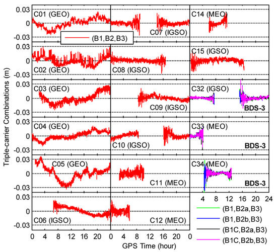Figure 3 depicts the time series of B1/B2/B3 triple-carrier combinations for BDS-2 satellites as well as B1/B2a/B3, B1/B2b/B3, B1C/B2a/B3 and B1C/B2b/B3 triple-carrier combinations for BDS-3 satellites at station SGG1 on 13 July 2016. The triple-frequency carrier phase combination is actually the difference between two different ionospheric-free carrier phase combinations, and Equation (3) shows an example of B1/B2/B3 combination. Numerical values of the coefficients for each triple-frequency carrier phase combination are given in Table 4. The phase ambiguity in triple-frequency carrier phase combination shown in Equation (3) is determined as the mean value of triple-carrier combination time series over the common continuous ambiguity block for all B1, B2 and B3 carrier phase observations. The phase ambiguity estimate is then removed from the original triple-carrier combination time series. It seems that an alternative way can be used to estimate the IFCB. However, the satellite revisit time for the stations located in different areas is different. The different tracking time of a satellite will affect the magnitude of its IFCB estimates. Bias variations are most evident for the BDS-2 GEO satellites and the oldest spacecraft C06 among the IGSO satellites. As to other BDS-2 satellites, small bias variations can also be recognized but they are generally confined to less than 2 cm. For BDS-3 satellites, in contrast, no significant biased variations can be observed and changes of the triple-carrier combination are often dominated by receiver phase multipath and noise (PMN). After the ambiguity term is eliminated in Equation (3), the residuals mainly include a weighted sum of phase noise, multipath and hardware delay. According to Pan et al. [20], the receiver phase hardware delay should be stable over several hours, and thus it will be included in the phase ambiguity estimate and removed together with the ambiguity term. As to the satellite phase hardware delay, it will also be eliminated together with the ambiguity term since the triple-carrier combination time series of BDS-3 satellites do not show significant trend term. Therefore, the triple-carrier combination variations of BDS-3 satellites mainly show PMN changes. Similar discussions can also be found in Montenbruck et al. [18]. The above noise refers to the measurement noise in carrier phase observations.