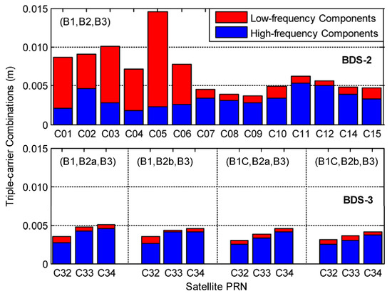 The root mean square (RMS) values of low-frequency and high-frequency components in the triple-frequency carrier phase combination time series for each BDS satellite are calculated using the datasets collected at SGG1 on 7–13 July 2016, and the results are shown in Figure 4. The wavelet decomposition and reconstruction is used to separate the low-frequency and high-frequency components from their combination. In this contribution, the threshold value for the distinction between low-frequency and high-frequency components is roughly 3 × 10−4 Hz, which is a compromise between different satellites since they show different noise level. It is important to note that the frequency threshold may be only appropriate for the datasets used in this paper. If we analyze the triple-carrier combination time series for GPS satellites, the frequency threshold should be determined once again. The Symlet wavelet ‘sym5’ is employed [36]. The high-frequency components mainly contain the PMN, while the low-frequency components mainly reflect the longer-term changes, namely IFCB variations. The RMS values of low-frequency components range from 0.2 to 0.9 mm for BDS-3 satellites, indicating that no significant IFCB variations can be observed for these satellites. The RMS values of low-frequency components vary within a range of 4.5–12.2 mm for BDS-2 GEO satellites, while the corresponding varying range is 0.8–5.2 and 0.7–0.9 mm for BDS-2 IGSO and MEO satellites, respectively. A further characterization and analysis of IFCB for BDS-2 satellites is required. It is interesting to note that the GEO satellites with relatively higher sun elevations above the satellite orbital plane such as C01 and C04 also have larger low-frequency components. This is because the low-frequency components may also contain partial multipath. Alternatively, other unknown factors may affect the variations of triple-frequency carrier phase combination with respect to a single station, which needs further investigation. Due to the comprehensive effects of multipath and IFCB, all the GEO satellites and the IGSO satellite C06 show larger RMS statistics of triple-carrier combination time series.