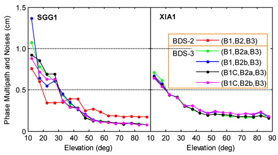 For the purpose of assessing the PMN level, the variation of RMS statistics of high-frequency components in the triple-carrier combination time series with elevation at SGG1 is plotted in Figure 5. The RMS values are computed with respect to the increment of satellite elevation angles in steps of 5°. The PMN variations are quite consistent for the four different triple-frequency carrier phase combinations of BDS-3 tracking. The BDS-2 satellites show larger carrier phase errors compared with BDS-3 satellites at mid and high elevation angles. At elevation angle of 87.5°, the RMS PMN for all four triple-carrier combinations of BDS-3 satellites is 0.8 mm, while the RMS PMN for the B1/B2/B3 triple-carrier combination of BDS-2 satellites is 1.7 mm. At the 22.5° elevation, the RMS PMN for the four different combinations of BDS-3 satellites varies in a range of 5.5–6.9 mm, while the corresponding RMS PMN for BDS-2 satellites is 3.5 mm. For comparison, the right plot illustrates the results from XIA1 of 2–15 September 2016. The receiver and antenna information for the stations SGG1 and XIA1 is listed in Table 5. A prototype receiver is set up at the station SGG1, and it is developed by one university in China. The stations SGG1 and XIA1 are equipped with different types of receivers and antennas. The comparison reveals the PMN differences caused by the different tracking performance of the specific receiver and antenna quality with respect to its multipath sensitivity as well as surrounding of the receiving antenna. According to the results at the two stations, the representative RMS errors at low elevations are 10 mm for the high-frequency components in the triple-frequency carrier phase combination, while the corresponding errors at medium and high elevations are 2 mm. Assuming, for simplicity, equal error variances on all frequencies, the 1σ PMN for triple-frequency combination is 2.3–2.5 times larger than that of the individual signals. We can conclude that the PMN errors for BDS tracking on a single frequency vary in a range of 1 to 4 mm over the considered satellite elevation ranges.