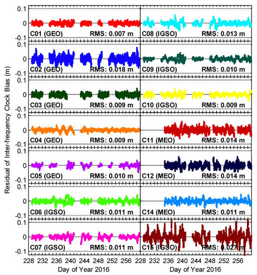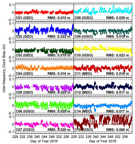 According to the results shown in Figure 6, the IFCB estimates of BDS-2 satellites are at a level of several centimeters and exhibit higher noise level, which may limit the applications of IFCB. There are two ways to solve this issue. One way is to increase the number of stations with the capability of offering B1/B2/B3 BDS-2 tracking since the accuracy and reliability of IFCB estimates are mainly determined by the station number in the network. The other way is to develop the efficient undifferenced estimation approach for IFCB because the ED strategy will generate accumulated error. The ED IFCB estimate of a satellite may be inaccurate at an epoch because of the effects of measurement noises when the number of stations that can track the satellite at the epoch is not sufficient. In addition, the gross errors have also effect on the ED IFCB estimation if the data quality check processing does not remove all of them. The error in ED IFCB estimate at the epoch will be introduced into the IFCB estimates at all subsequent epochs due to accumulation. Likewise, the latter epochs may also show similar behavior. As a result, the IFCB estimates will exhibit drifting, such as the IFCB estimates of C15 shown in Figure 6. The ED strategy is suitable for GPS as the peak-to-peak amplitudes of single-day IFCB series can be up to 0.269 m [20].