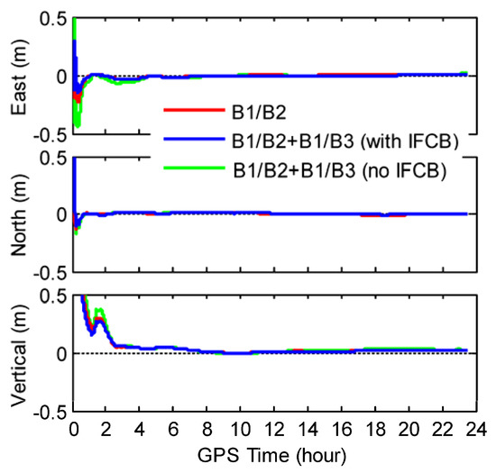 The GNSS of the future will feature the combination of multi-constellation and multi-frequency signals. In this paper, we focus on triple-frequency integration. A key issue in triple-frequency PPP is to align the satellite clocks, namely IFCB consideration. The IFCB of GPS Block IIF satellites has been investigated by many researchers in terms of sources, dependence, periods, prediction, modeling, variations and amplitude limits [13,14,20,21]. The GPS multipath, which can be extracted using the ionospheric-free geometric linear combination, is a function of satellite elevation angle and antenna height, etc. [25,26,27]. The multipath effects should be considered during the IFCB estimation with the use of DIF measurements consisting of two different ionospheric-free carrier phase combinations. Full consistency of three carriers can be ensured for QZSS and Galileo, and thus the IFCB in multi-frequency integrated precise positioning can be ignored for them [15,16,17]. Several studies also relate to the IFCB of BDS-2 satellites [18,19]. Compared with their results, a wider range of IFCB variations is obtained because the datasets spanning a longer period of time are involved in the analysis. In addition, some initial results are presented, including the analysis of cross-correlation and prediction for real-time precise positioning users as well as the IFCB of BDS-3 satellites. Guo et al. [5] implemented the triple-frequency PPP with BDS data for the first time. However, the additional frequency had a marginal effect on the positioning accuracy in their results, likely because they neglected the effects of IFCB. By contrast, the triple-frequency PPP solutions here achieve higher positioning accuracy in comparison to dual-frequency PPP solutions. The consideration of the triple-frequency measurements for PPP for any satellite system was also discussed in the literature [40], which shows that one can model the triple-frequency code biases, and rigorously provide them for the PPP users for positioning. The difference between the two literatures on triple-frequency PPP is that another S-basis (datum) has been used in Odijk et al. [40], but one can transform between any S-basis choices through an S-transformation. Moreover, the code observations were also rigorously taken into account so as to maximize the redundancy of the models in the literature [40], which is a limitation for triple-frequency PPP model developed in this paper.