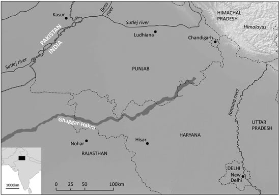 - Singh, R.N.; Petrie, C.A.; Pawar, V.; Pandey, A.K.; Parikh, D. New insights into settlement along the Ghaggar and its hinterland: a preliminary report on the Ghaggar Hinterland Survey 2010. Man Environ. 2011, 36, 89–106. [Google Scholar]