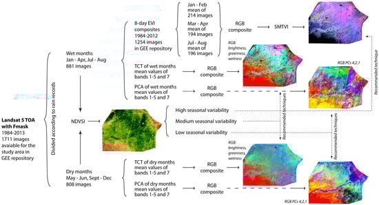 - Kauth, R.J.; Thomas, G.S. The tasselled cap−A graphic description of the spectral-temporal development of agricultural crops as seen by LANDSAT. In Proceedings of the Symposium on Machine Processing of Remotely Sensed Data, Purdue University of West Lafayette, Indiana, 1976; Institute of Electrical and Electronics Engineers: New York, NY, USA, 1976; pp. 4B-41–4B-51. [Google Scholar]