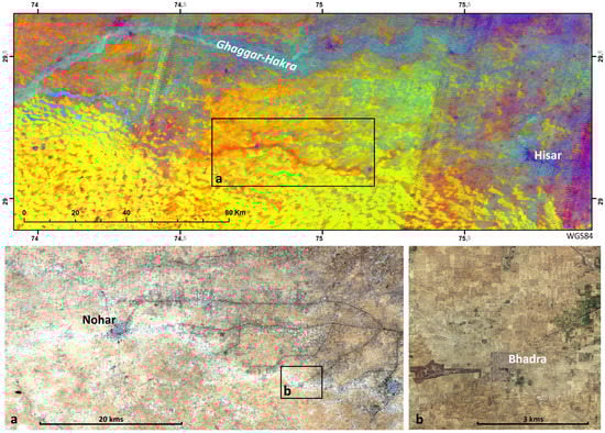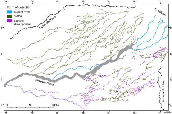 - Gupta, A.K.; Sharma, J.R.; Sreenivasan, G. Using satellite imagery to reveal the course of an extinct river below the Thar Desert in the Indo-Pak region. Int. J. Remote Sens. 2011, 32, 5197–5216. [Google Scholar] [CrossRef]
