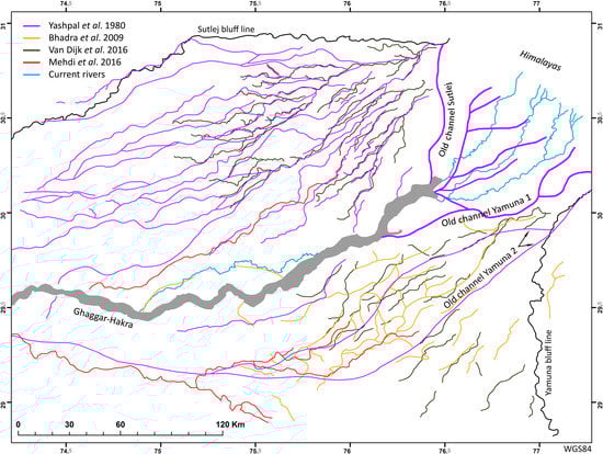 - Sharma, D.C.; Kalra, N.K.; Srivastava, A.; Singh, R.B. An appraisal of space technology to identify the palaeochannels of river Saraswati in Anupgarh, Pilibanga and parts of Ganganagar and Hanumangarh districts. In Geological Evolution of Northwestern India; Paliwal, B.S., Ed.; Scientific Publishers: Jodhpur, India, 1999; pp. 260–270. [Google Scholar]