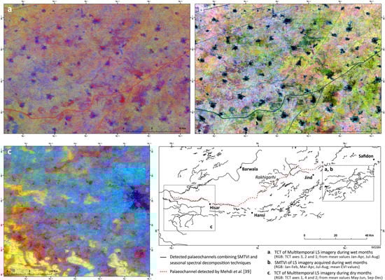 - Mehdi, S.M.; Pant, N.C.; Saini, H.S.; Mujtaba, S.A.I.; Pande, P. Identification of palaeochannel configuration in the Saraswati River basin in parts of Haryana and Rajasthan, India, through digital remote sensing and GIS. Episodes 2016, 39, 29–38. [Google Scholar] [CrossRef]