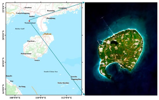 Specifically, Weizhou Island is located at 21°00′–21°05′N, 109°00′–109°10′E, approximately 36 miles from Beihai, Guangxi, as shown in Figure 1. Its coverage area of Weizhou Island is approximately 25 km2. According to Wang et al. [12], the annual average Sea Surface Temperature (SST) and salinity values around Weizhou Island are about 24.55 °C and 31.9‰, respectively, thus it is ideal for coral growth even though the seawater transparency varies only from 3.0 m to 10.0 m [12]. Coral reefs have developed around Weizhou Island since the mid-Holocene, and these reefs cover an area of approximately 6–8 km2 [13,14]. These coral reefs have long been the focus of studies analyzing the responses of coral to global warming and human disturbances, because they are located in a relatively high-latitude area and are heavily influenced by anthropogenic activities [12,14,15,16].