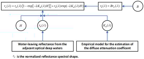 For example, according to a radiative transfer model that can connects the water-leaving reflectance of the optically deep waters , the bottom reflectance , the diffuse attenuation coefficient of the water column , and the water depth to the water-leaving reflectance as follows [36,37]: