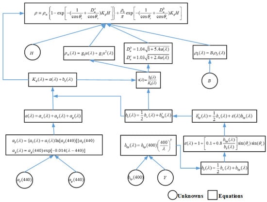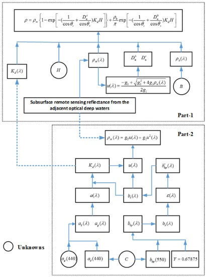 For example, the semi-analytic bathymetric model developed by Eugenio et al. [38] can be summarized as shown in Figure 3. Specifically, the optimum values of , , , , and are determined by minimizing the differences between the observed subsurface remote-sensing reflectance and the estimated reflectance, where is the attenuation coefficient for phytoplankton at 440 nm, is the attenuation coefficient for gelbstoff at 440 nm, is the backscattering coefficient for particles at 400 nm, is the spectral shape that depends on the particulate shape and size, is the bottom albedo at 550 nm, and is the water depth. This approach requires researchers to first initialize the parameter by applying the ratio algorithm, and then, to solve the nonlinear Model (3) using the Levenberg–Marquardt method.