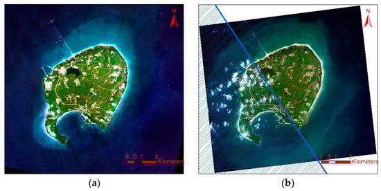 The experimental multispectral images: (a) the ZY-3 multispectral image; and (b) the WV-3 multispectral image. Based on the division represented by the straight line, the western region of the WV-3 image may be seriously influenced by clouds; therefore, we only study the eastern region of the WV-3 image in our experiments.