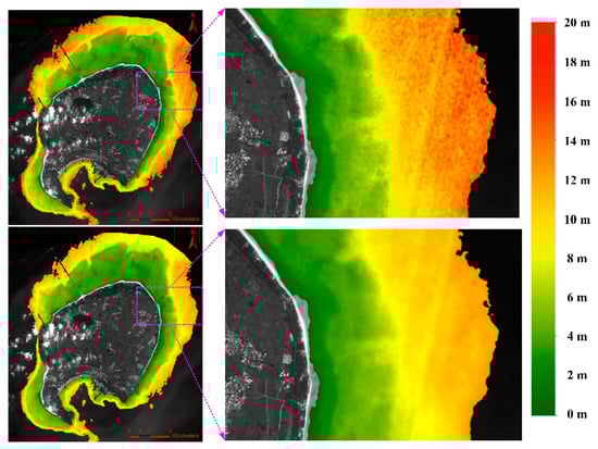 Shallow seawater depth measurements are considered to be very important, as they are directly relevant to the applications of environmental management, exploration, and research [1,2,3,4]. For example, the natural development of coral reefs can strongly influence the physical structure of their environment. Information associated with water depth is fundamental for characterizing and discriminating between different kinds of coral reef habitats, such as patch reefs, spur-and-groove systems around reef fronts, and sea grass beds [1]. The knowledge of the water depth can also facilitate estimations of the bottom albedo, which can improve the habitat mapping [5]. Therefore, shallow water depth measurements have consistently represented an important component of marine surveying and mapping.