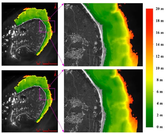 We note that the global adjustment sub-approach depends slightly on the assumption that most water depths should be similar to each other between one pixel and its adjacent pixels. This may indicate that this method involves an implicit assumption that the detected sea floor elevations are continuous and vary gradually. Thus, when the sea floor is not sufficiently continuous, this refinement may become inaccurate or may even fail. Fortunately, when the weight of the smooth item (the second item of the objective function, Equation (22)) is set as a small value (), we find that the smooth item mainly works when the noises are sensitive or their influences are serious, as discussed in Section 5.2. In other words, when the noises of the images are significantly sensitive or the influences of the noises are serious, the global adjustment approach works well on improving the water depth results, otherwise the global adjustment approach is able to avoid the over-smoothing of the water depths.