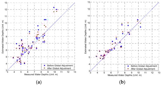 As a result, we believe that the proposed global adjustment sub-approach can be applied to estimate the water depth of many types of sea floors. Specifically, the proposed approach has great potential for the marine surveying and mapping of large, remote, or dangerous areas in the future, particularly for further research on the bathymetries of typical coral reefs.