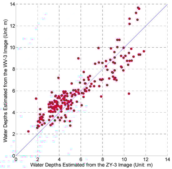 In addition, Figure 12 further demonstrates that these comparisons between the water depths estimated from the ZY-3 and the WV-3 images are similar to the results derived from the transect shown in Figure 13; the results of statistical analysis indicate that the value of the root mean square error is 1.24 m (see Section 4.3).