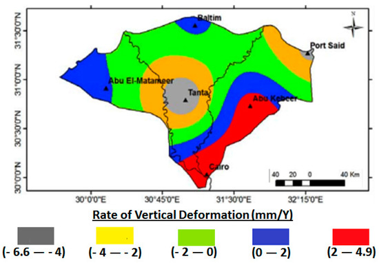 Repeated GPS observations for six stations over the Nile Delta covering the period from 2012 to 2015 were compiled, processed, and analyzed to estimate the land subsidence rate by Hoda et al. [32]. Results of the Hoda et al. [32] study show that land subsidence exists in Port Said and Tanta (Figure 2), while the remaining four stations of the Nile Delta show uplift with vertical land movements ranging from +4.9 to −6.5 mm/year, while the horizontal ground movements vary from 4.2 to 6.6 mm/year in the northeast direction [32].