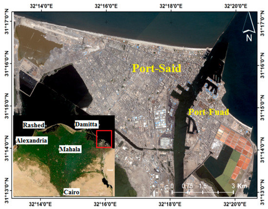 Port-Said Governorate lies in the northeastern side of the Nile Delta extending about 30 km along the coast of the Mediterranean Sea and north of the Suez Canal between latitudes 31°00′N and 31°20′N, and longitudes 32°00′E and 32°30′E (Figure 3). The Governorate is bounded by the Mediterranean Sea from the north, Lake Manzala from the west, Lake Malaha from the east, and has a total area of about 1351 km2 with an approximate population of 517,216 [44].