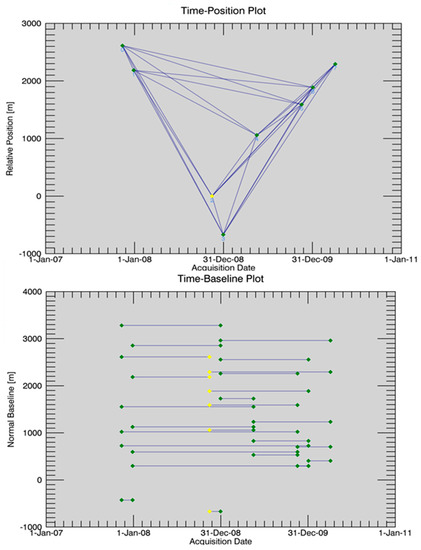 where the carrier wavelength is , is the slant range, the incident angle and the effective critical baseline are all defined in a plane perpendicular to the flight paths. Therefore, is the slant-range resolution and is the factor equal to two for a repeat-pass, where each radar image is acquired with its own illuminator. Based on the previous equation, the SLC PALSAR image, which had been acquired on 14 November 2008, was chosen automatically as the super master image by generating a connection graph between the eight ALOS PALSAR images using the SARscape software. Figure 6 shows the relative positions of the used slave SAR images with respect to the super master position, and was used to understand and evaluate the connections between the slave and master images. Every acquisition should be connected with others and if a group of acquisitions cannot be connected to the main network, all the acquisitions belonging to this group are discarded. For this reason, it is suggested to collect images at regular time intervals with small baselines (Figure 6). All slant ranges of the eight PALSAR images were co-registered with super master geometry, which was used as reference image.