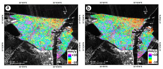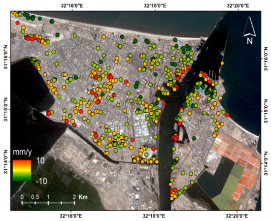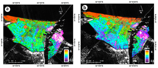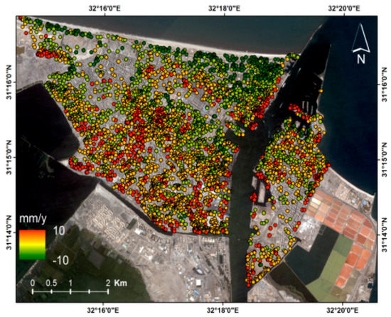It can be clearly observed in Figure 14 that most of the subsidence rates are located in the northern part of Port-Said City, where dense buildings and skyscrapers are located, but some are in the southwestern part of the study area. The subsidence was checked in the field by observing many cracks in the buildings and their lower ground level position compared with the street level. Subsequently, the Line of Sight (LOS) deformation and subsidence rate for each of the fringes were calculated, and finally the weighted average of subsidence rate was calculated for continually subsiding areas, i.e., areas where overlapping fringes were seen in multiple interferograms. The subsidence rates were extracted from the different interferograms, which represent different years, and combined together to obtain the total subsidence rate affecting the study area.