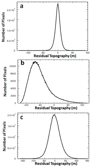 Thus, the wavelet number used in this study was set to zero level because of the high fidelity of the reference DEM derived from ALOS/PRISM data. Due to the DEM’s high spatial resolution, its sensitivity is large enough to estimate the average residual topography to almost 0 m with a standard deviation equal to 9.5 m (Figure 9a). Moreover, the accuracy of the SRTM DEM data was checked in order to compare its results with the field calibrated ALOS/PRISM DEM. The 0 wavelet numbers was also used with the SRTM data and showed average residual topography equal to −52.5 m and high standard deviation equal to 35.1 m (Figure 9b). Meanwhile the two wavelet numbers were also used with the SRTM data and showed average residual topography equal to −1.5 m and high standard deviation equal to 25.03 m (Figure 9c). It is obviously clear that even after using large wavelet number with the freely available SRTM data, the PRISM data with 0 wavelet number showed an improved estimation for the average residual topography.
