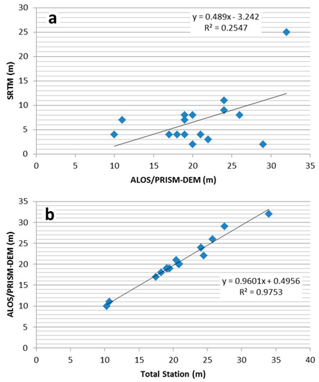 Figure 12 illustrates the comparison between the extracted DEM from ALOS/PRISM data with respect to the calculated points in the field using the total station and the SRTM DEM. The figure shows around 10 m height differences between the SRTM and PRISM DEM data. This is because the generated DEM using ALOS/PRISM has around 2.5 m vertical height accuracy, while the SRTM has around 16 m absolute vertical height accuracy and around 10 m relative vertical height accuracy [58].