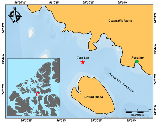 Map of Resolute Bay region (indicated in green dot) in Resolute Passage in the Canadian Arctic, Nunavut, Canada. Study site location is indicated in red star. Snow covered first-year ice accumulated areas are depicted in light blue, and land in brown. Note: A similar figure with different color scheme can be found in [14].