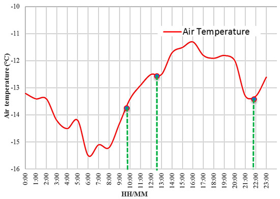 Hourly air temperature measured on 19 May 2012, from the on-ice micro-meteorological station. Colored dots represent times of in-situ snow property measurements at ~9:45 a.m. (for 14 cm), ~12:25 p.m. (for 4 cm) and ~9:30 p.m. (for 8 cm) local times. Green vertical lines denote the timing of the scatterometer measurements quasi-coincident with the in-situ snow thermophysical property measurements.