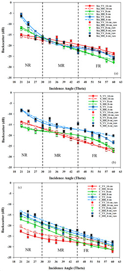 The Ku-, X- and C-band demonstrate frequency separation, with prominent variability of with from all three different snow cover cases (Figure 6). For the 14 cm and 8 cm snow covers, Ku-band clearly shows greater than , especially in NR and MR, suggesting dominant volume scattering from the top most decomposed and fragmented precipitation particles ( ~0.8 mm; Table 1 and Table 2) (Figure 6a,b). X-band exhibits increasing reflective behavior with decreasing snow thickness, suggesting greater sensitivity of X-band HH-polarized waves to the increase in snow salinities and snow dielectrics (Table 4 and Table 6) (Figure 6a–c). C-band clearly exhibits greater than from all three snow covers, justifying strong reflective behavior of C-band HH-polarized microwaves (Figure 6a–c). Nevertheless, C-band microwaves do not exhibit characteristic variability of with , when compared to Ku- and X-bands, especially with the thicker 14 cm and 8 cm snow covers. The mechanisms responsible for this behavior are clear, as both 14 cm and 8 cm snow covers exhibit almost similar thermophysical (Table 1, Table 2 and Table 3) and dielectric properties (Table 4 and Table 6).