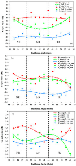 Calculated Ku-, X- and C-band co-pol ratios () from 14 cm, 8 cm and 4 cm snow covers on FYI: (a) Ku-band; (b) X-band; and (c) C-band. Co-pol ratio trend lines are cubic fits. Colored points represent measurement points. Vertical black dotted lines partition near-range (NR), mid-range (MR) and far-range (FR) incidence angles.