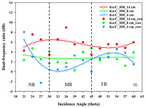 The dual-frequency ratio () (in dB) is the innovative parameter introduced in this study, and is the difference in the radar backscatter between any two frequencies at the same polarization. For example,