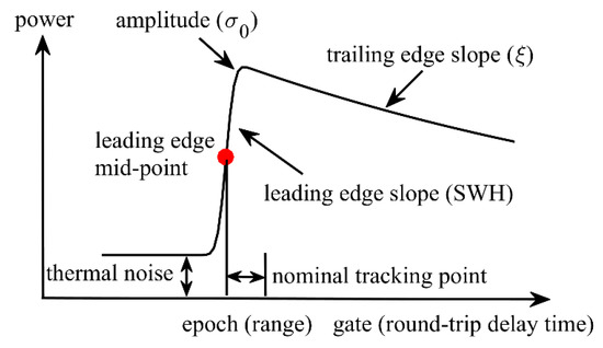 As shown in Figure 1, a typical Brown waveform which is controlled by the altimeter antenna gain pattern, has a well-defined shape consisting of three parts, thermal noise, a fast-rising leading edge, and a decaying trailing edge. The fundamental parameters obtained through waveform retracking are the satellite height above the sea surface (range), the significant wave height (SWH), and the backscatter coefficient (sigma0, ), which is related to sea surface wind. Moreover, an antenna mispointing angle (ξ) parameter, which is linked to the slope of the trailing edge, has a strong impact on sigma0 estimation because it reduces the apparent backscatter coefficient for the radar antenna (i.e., any deviation of the radar aiming point from nadir).