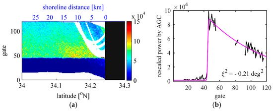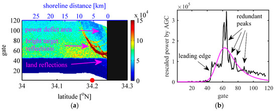 In contrast to the open ocean, waveforms collected when the altimeters operate in proximity to coastlines are often corrupted due to the heterogeneous surfaces. Figure 2a shows the along-track waveforms (or azimuth-range radar-gram; hereafter referred to as an echogram) measured by the Jason-2 altimeter over the southern Tsushima Islands in Japan (pass 36, cycle 22). Each column of the echogram represents an individual waveform at a given latitude. Waveforms in the echogram have been realigned based on the tracker movements and rescaled by the automatic gain control (AGC) of the antenna [4]. Waveforms measured over land areas are masked in the echogram because they cannot be properly realigned. As can be seen in Figure 2a, land reflections are generally significantly weaker than reflections from the sea surface [5]. This is why the trailing edge of a waveform will decay rapidly when an altimeter approaches land, thereby resulting in a power deficit area in the echogram [6]. Moreover, several bright parabolic traces can be seen at the waveform trailing edge area, which indicate that bright targets exist within the altimeter footprint.