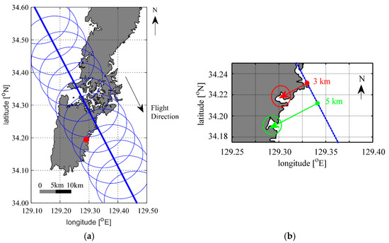(a) Ground track (blue line) and footprint (blue circles draw for every 1 s, radius is 10 km) of the Jason-2 altimeter over the Tsushima Islands (pass 36). The shortest distance between the tide gauge (red point) and altimeter ground track is about 6 km; (b) Enlarged local map for the southern section of the pass. The vertices in Figure 2a indicate that the reflection points are located 3 km and 5 km apart from the nadir track at 34.23°N and 34.21°N, respectively. These locations, which include semi-closed bays, are marked by circles.