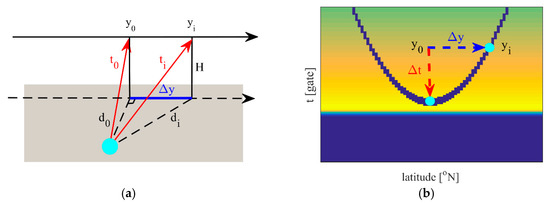 As shown in Figure 4a, represents the location at the nearest approach to a high reflector on the sea surface, while and represent the round-trip delay time and geographical distance, respectively. is a point located at a distance from , while and represent the corresponding round-trip delay time and geographical distance, respectively. Considering the geometric relationship, , Equation (1) can be expressed as: