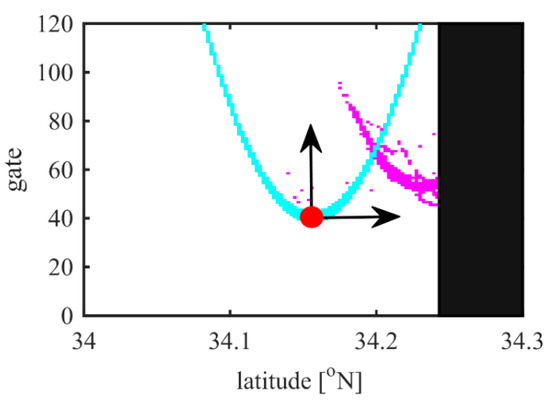 The parabolic shape determined by Equation (2) in an echogram is shown in Figure 4b. The horizontal axis represents the latitude of the satellite nadir. The vertical axis represents the round-trip delay time for the gate, and the sampling resolution is 3.125 ns for Jason-2. The vertex of the parabola is related to the location of the bright target, as seen in Figure 3b, and the parabola shape is solely determined by the altimeter’s orbital and sampling parameters.