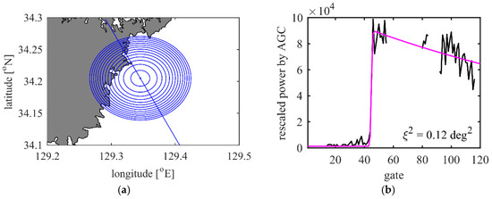 Figure 7a shows the annular footprints for the waveform measured at 34.20°N (red point in Figure 2a). The compensated waveform and the corresponding fitted Brown waveform are shown in Figure 7b. Compared with Figure 6b, a positive mispointing angle is obtained. The improved positive mispointing angle is found all along the track, as shown in Figure 8d. Additionally, sigma0 shows a drop near the coast before the land compensation (Figure 8c), indicating stronger wind speeds, but the SWH remains almost the same as that for the open ocean (Figure 8b). After the land compensation, it can be seen that this sigma0 drop inconsistency near the coast has been modified.